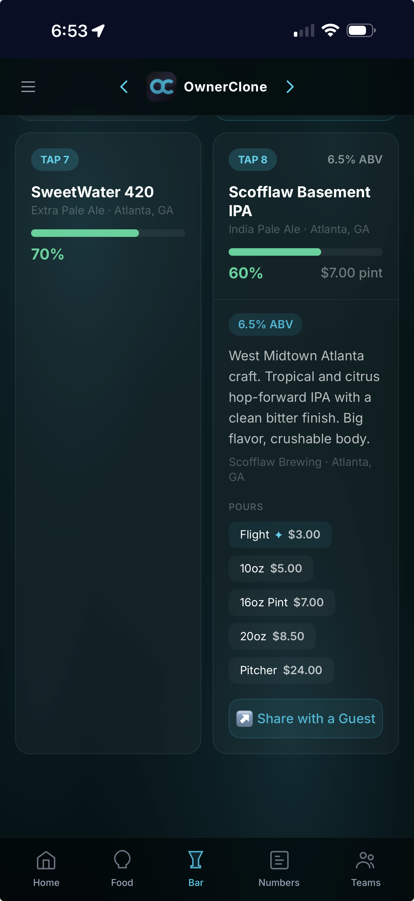 Tap any beer to see its full profile β ABV, brewery, style, pour sizes, prices, and a "Share with a Guest" button that sends a digital beer card to their phone. It's the kind of thing that makes people talk about your bar.
