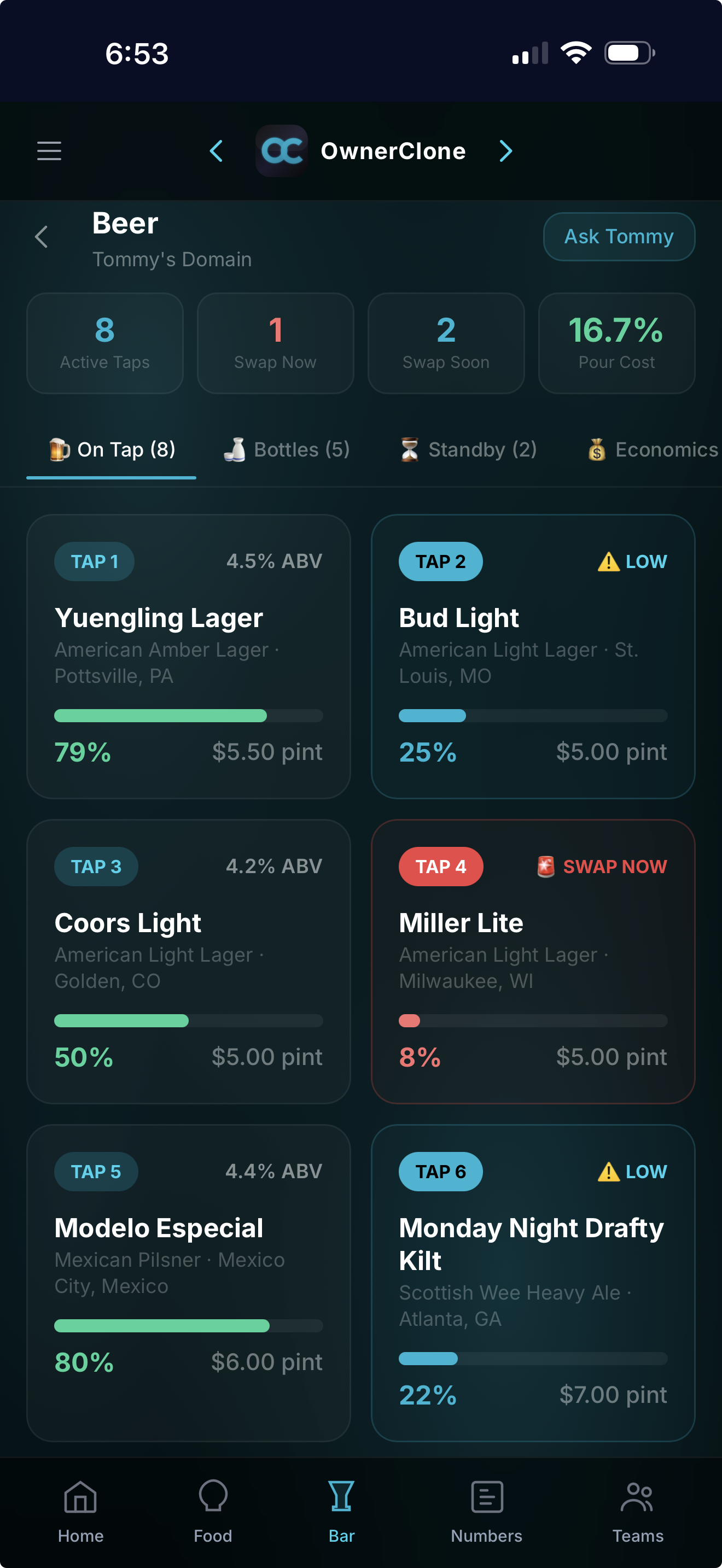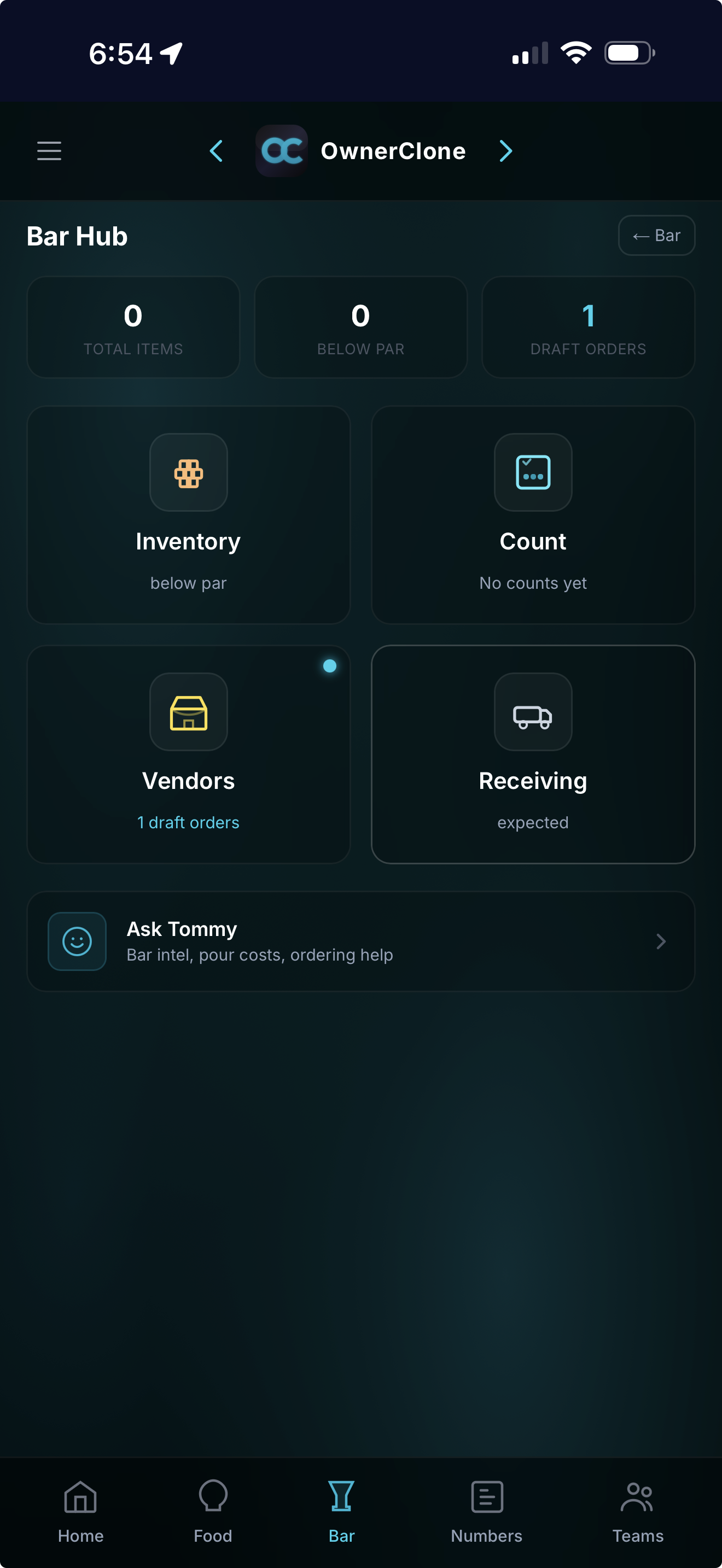 Tommy is your AI bar manager. Ask him anything β pour costs, what to order, cocktail ideas, pricing strategy, inventory questions. He knows your bar better than anyone on your staff.