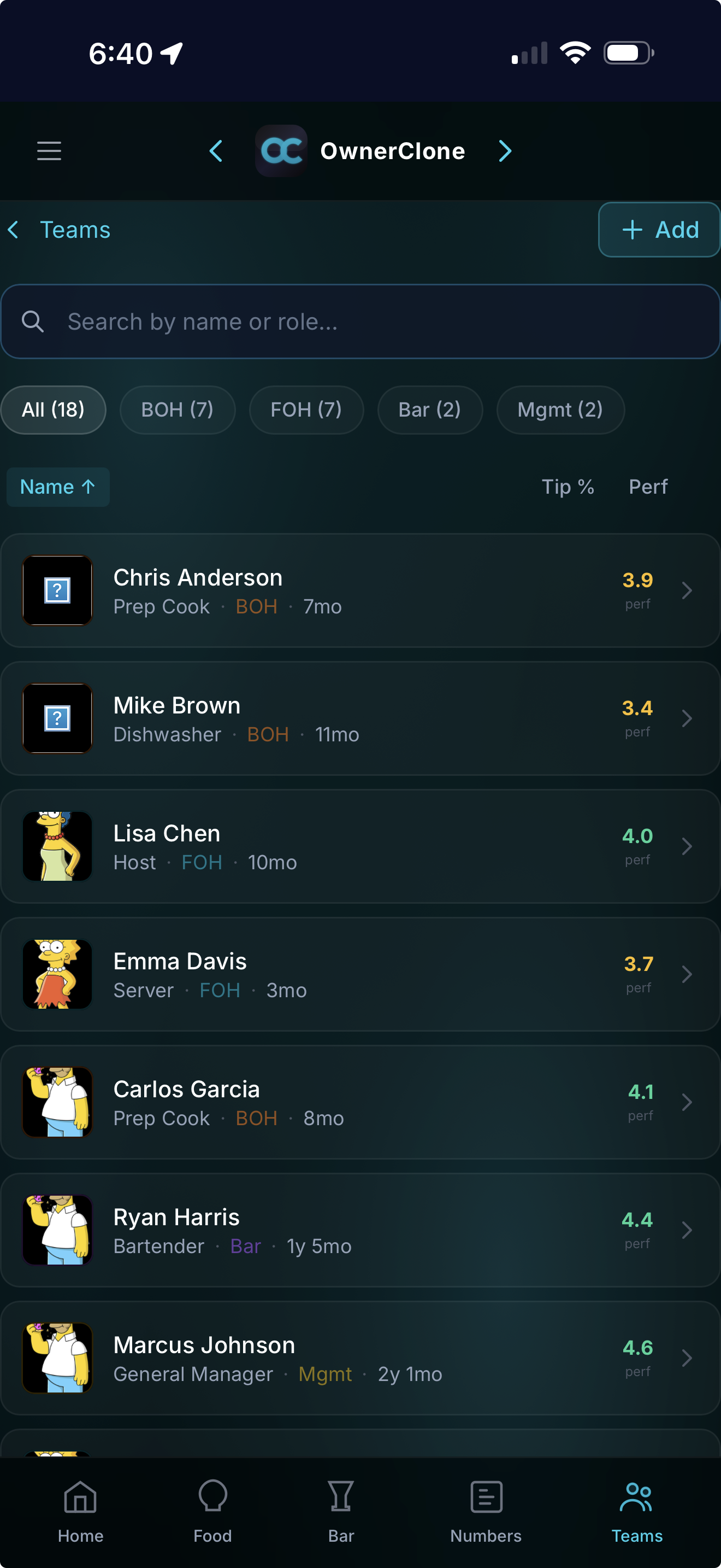 Your full team roster with performance ratings, roles, certifications, and attendance. 18 staff across BOH, FOH, Bar, and Management tracked in one place. See who's showing up and who isn't.