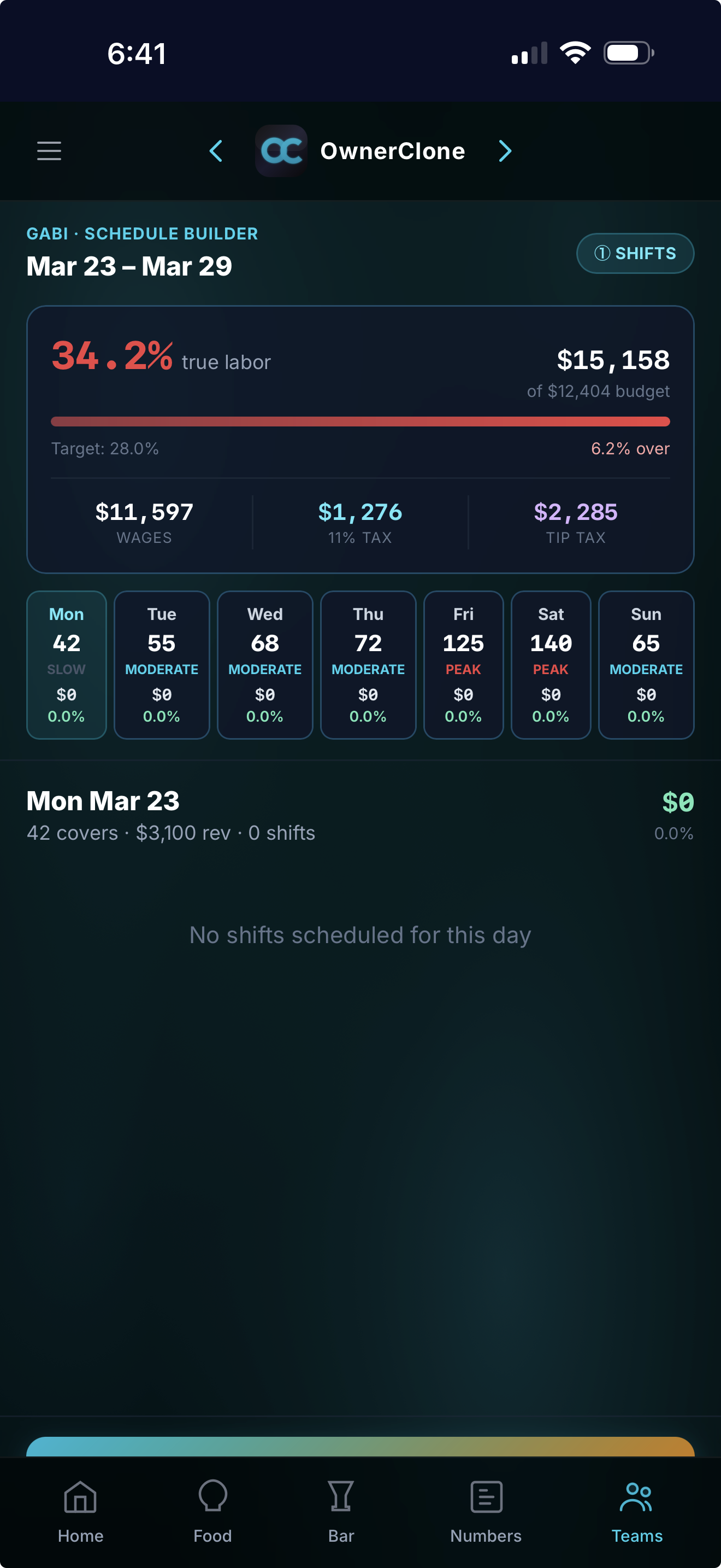 Gabi builds your schedule based on real demand forecasts — not guesswork. She knows your historical sales, your upcoming events, and your labor targets. The result: the right people, the right shifts, under budget.