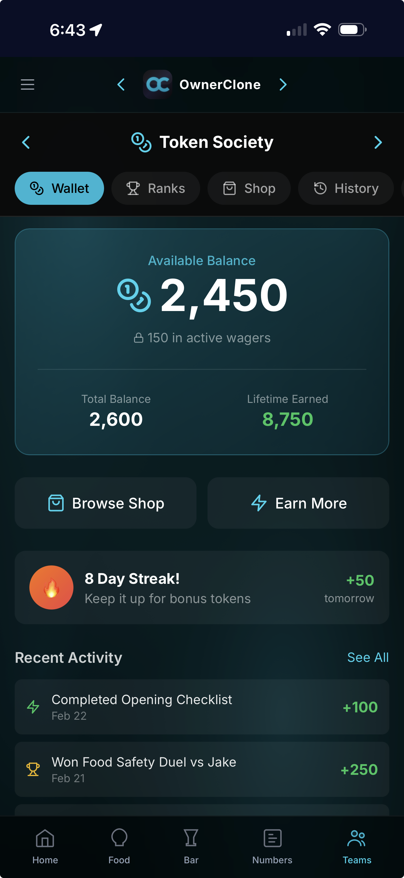 Your team earns tokens for completing tasks, training, streaks, and achievements. They spend them in the Token Shop on real rewards: priority scheduling, free shift meals, early release, gift cards.