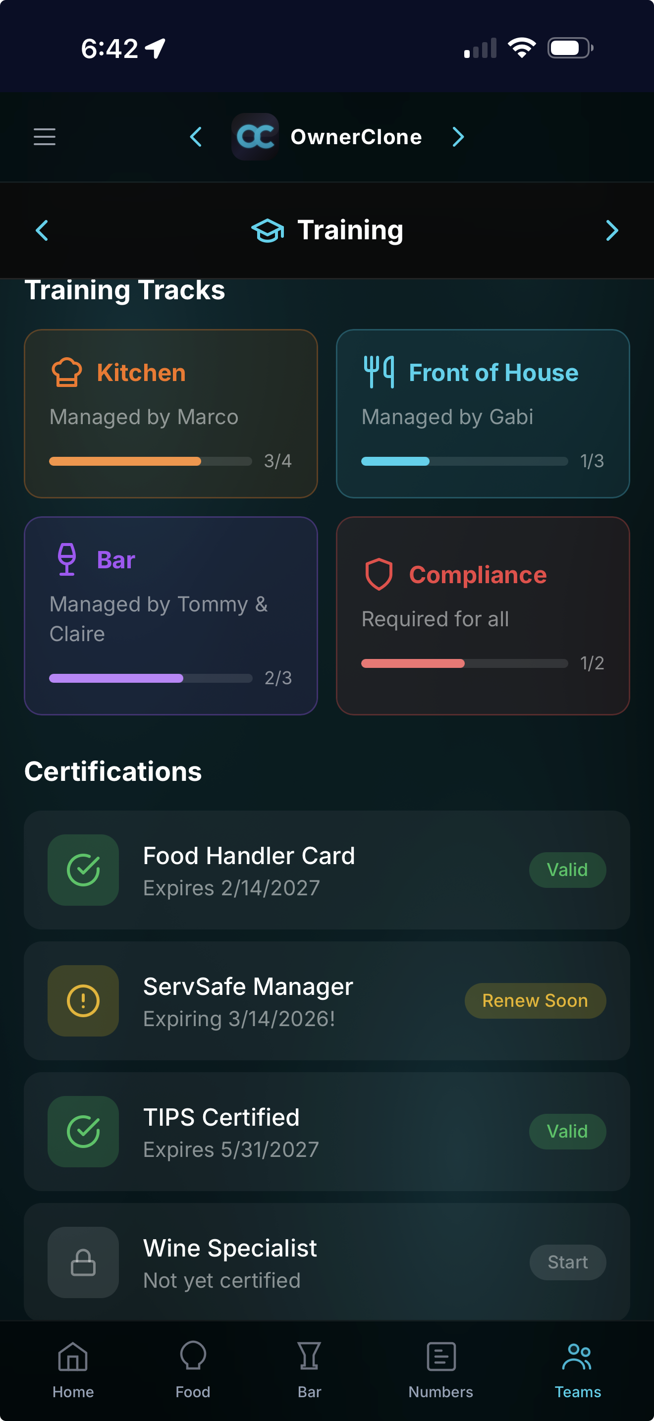 Staff complete training tracks and earn certifications tracked inside the app. Your standards become their competitive advantage — and they're motivated to prove it.