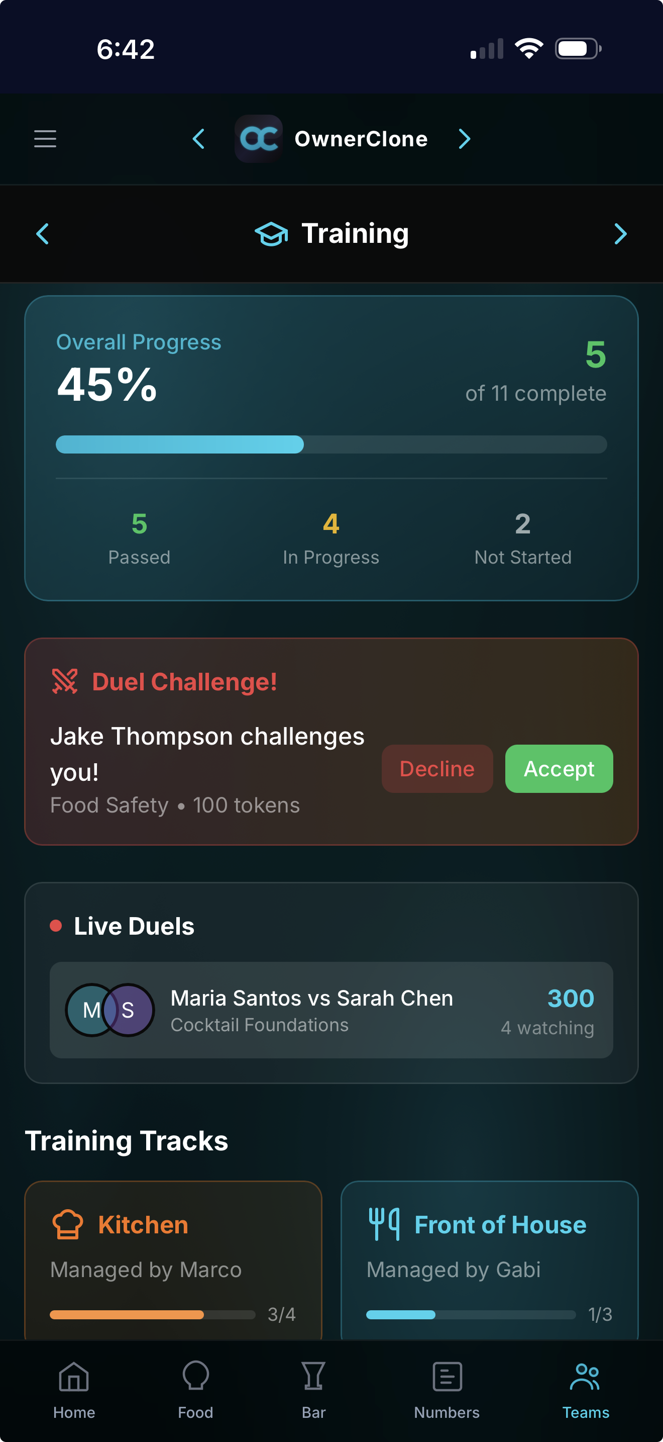Training Duels pit two staff members head-to-head in a live training battle watched by the whole team. Maria Santos vs Sarah Chen, Cocktail Foundations, 300 tokens on the line, 4 people watching. That's training with stakes.