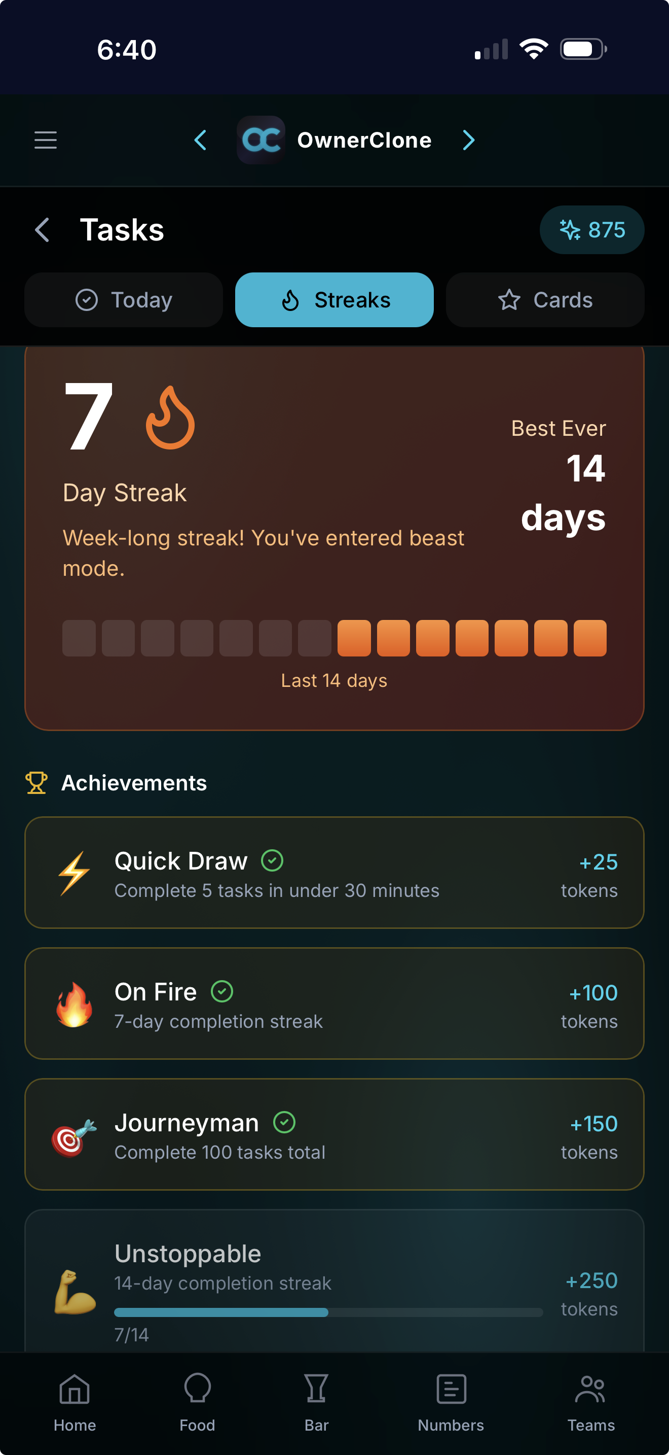 7-day completion streaks with fire badges. Miss a day and the streak resets. Maintain it and earn escalating achievement bonuses. Simple psychology that works.
