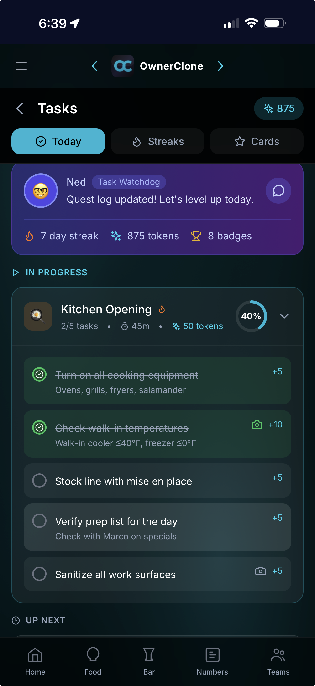 Every opening checklist, closing checklist, and sidework list runs through the app. Staff check off items, earn tokens, build streaks, and unlock achievements. Ned monitors everything and alerts you when something's been missed.
