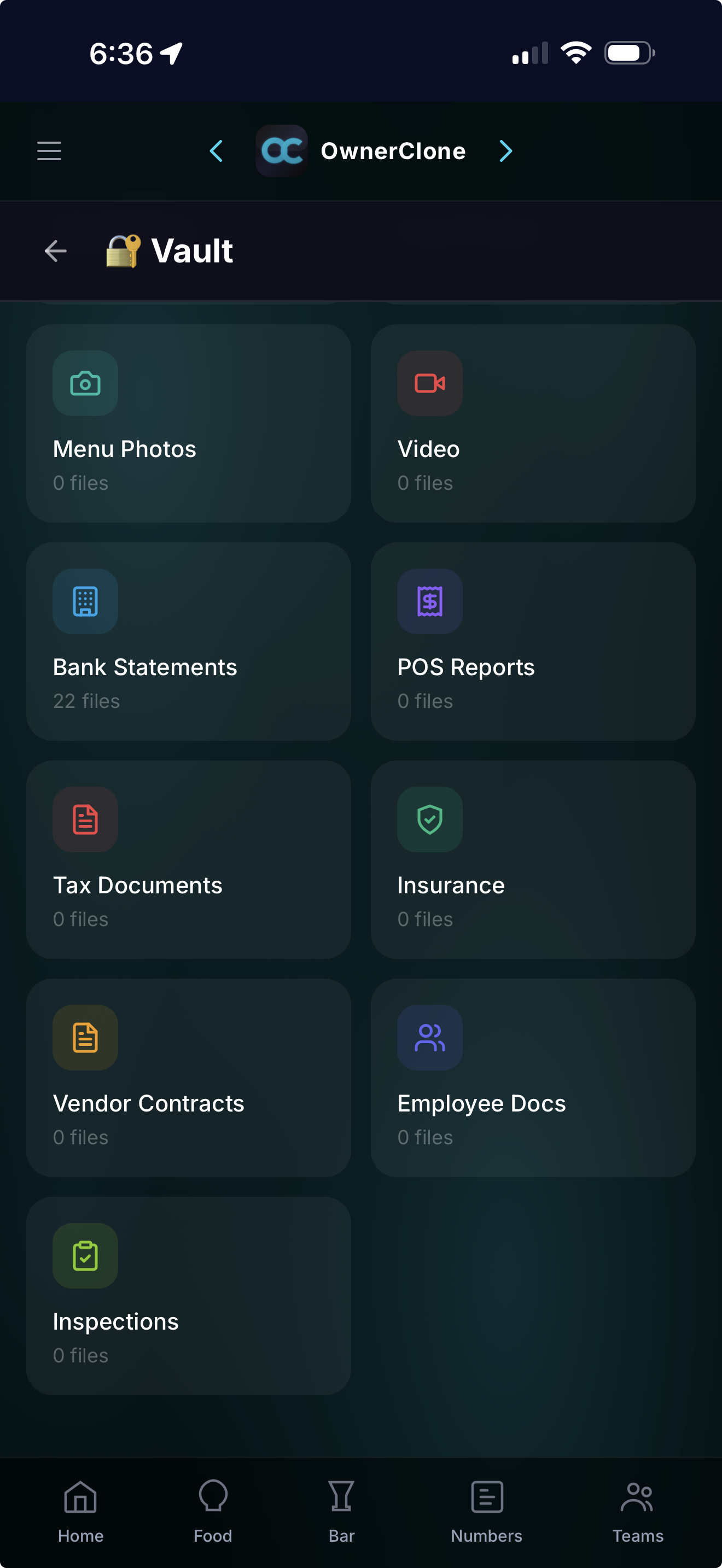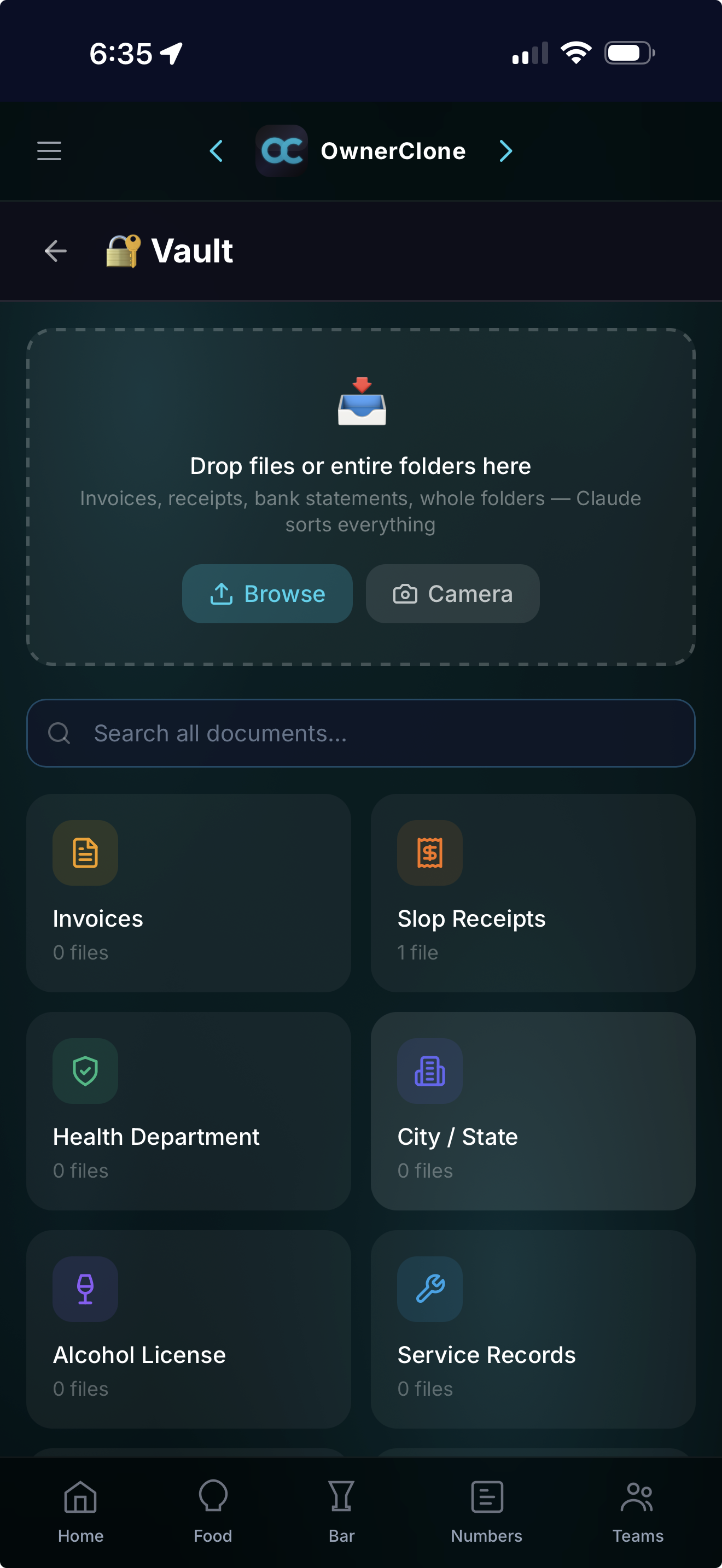 Drag files, snap photos, forward emails. Your Vault accepts everything and organizes it automatically. Bank statements, invoices, health department reports, employee docs — all searchable, all permanent, all yours.