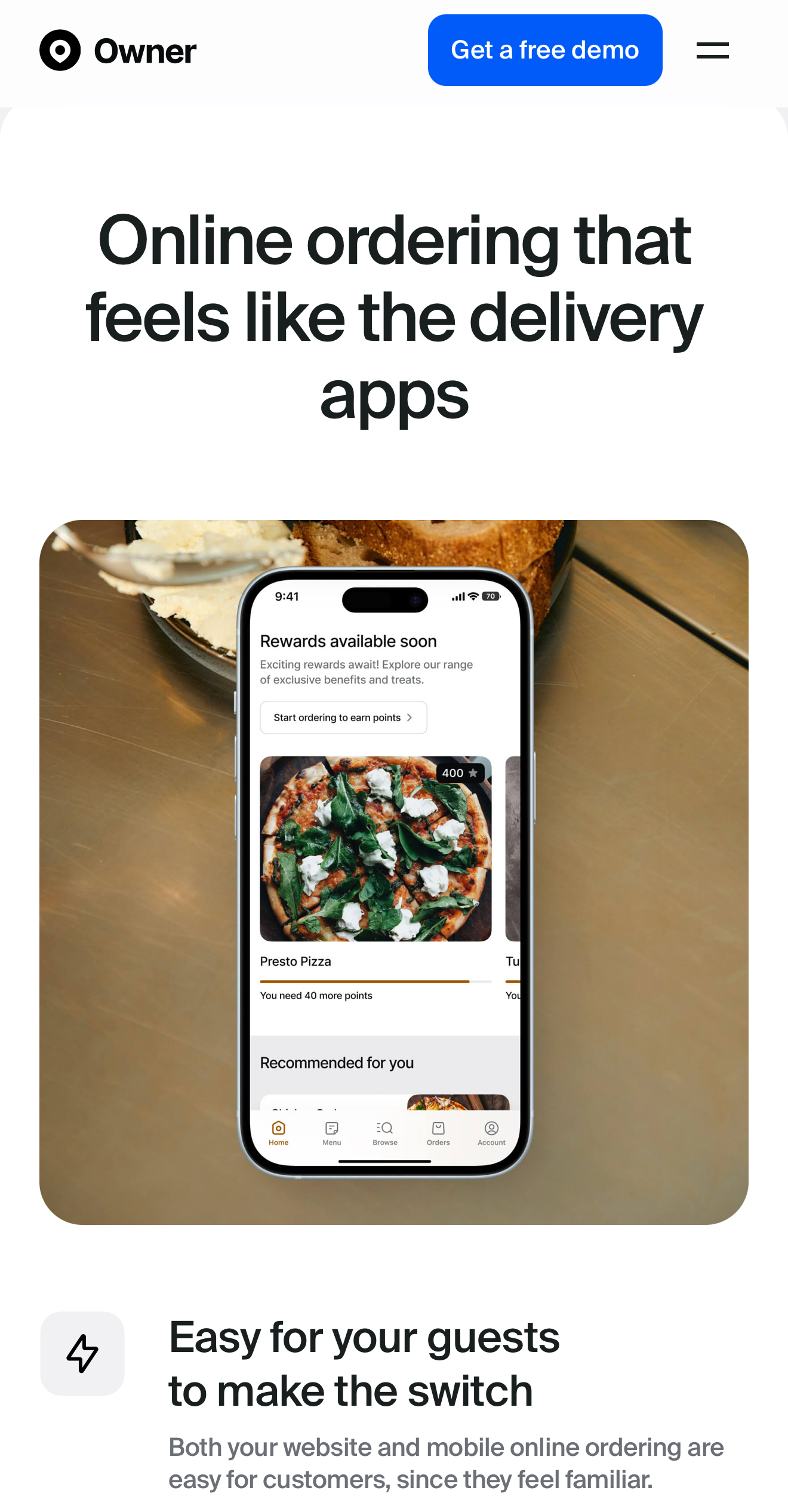 We manage and streamline your daily operations on Owner.com, helping you boost online orders, enhance your website's visibility, and improve your Google rankings. Our service includes rebuilding and optimizing your website, as well as creating a fully functional app tailored specifically to your restaurant's needs.